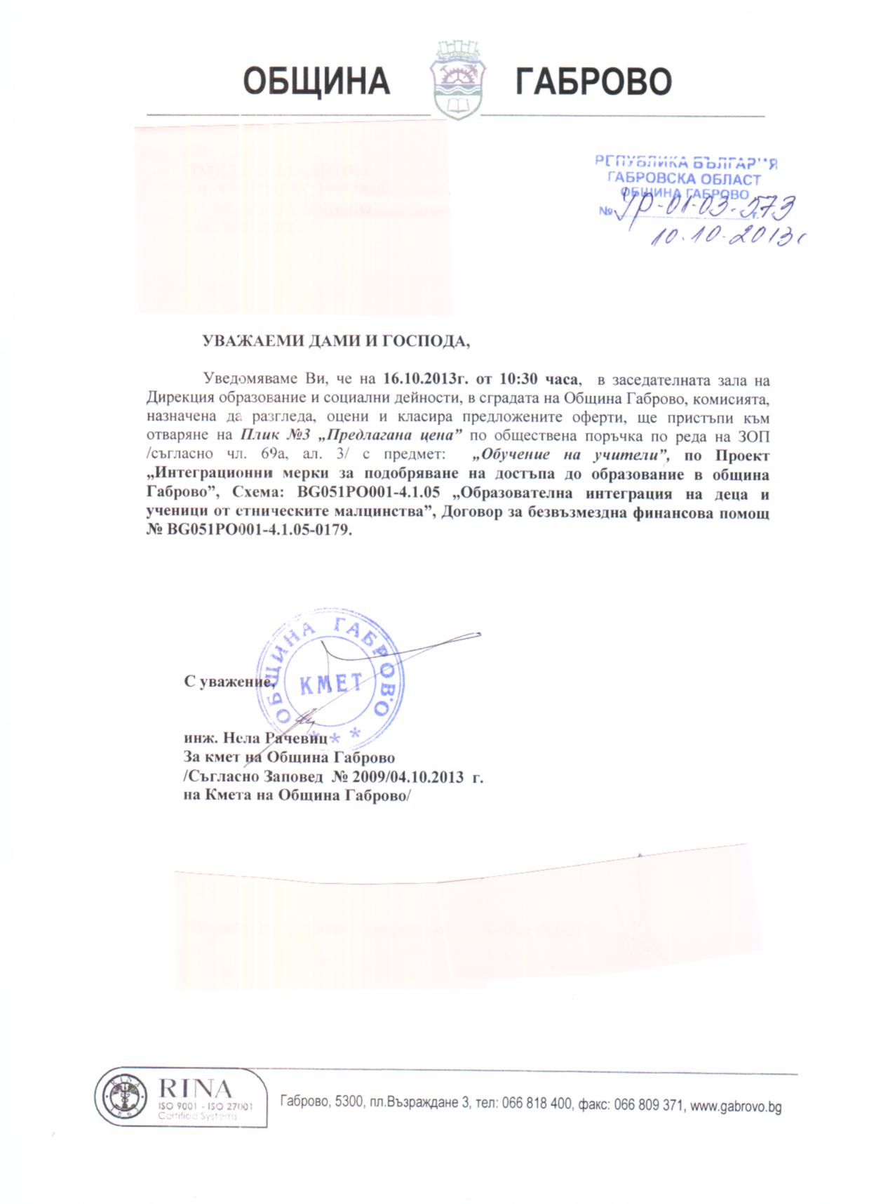 Съобщение за отваряне на ценови предложения по обществена поръчка с предмет: "Обучение на учители", по Проект "Интеграционни мерки за подобряване на достъпа до образование в Община Габрово", Схема: BG051PO001-4.1.05 "Образователна интеграция на деца и ученици от етническите малцинства”, Договор за безвъзмездна финансова помощ № BG051PO001-4.1.05-0179.