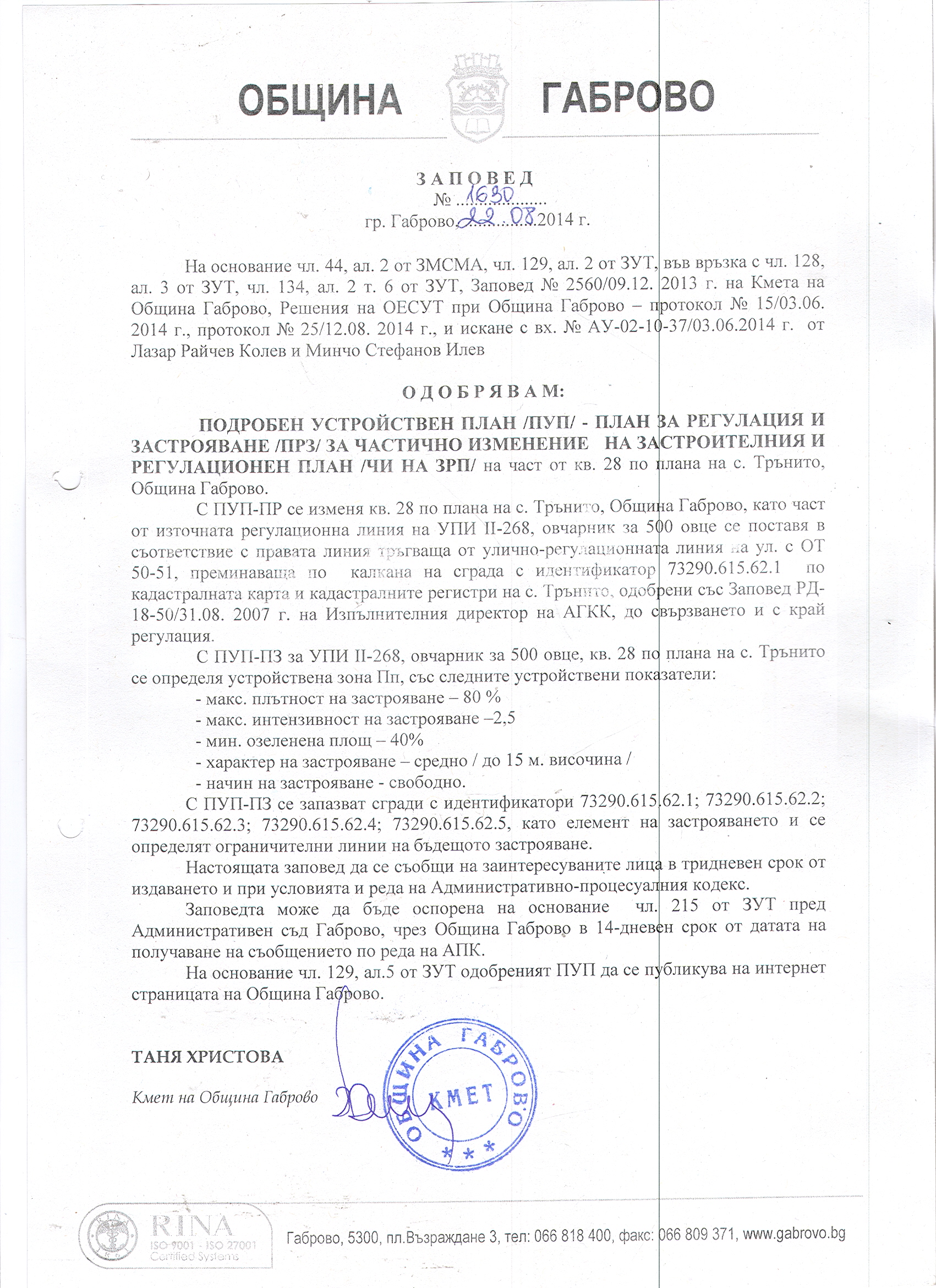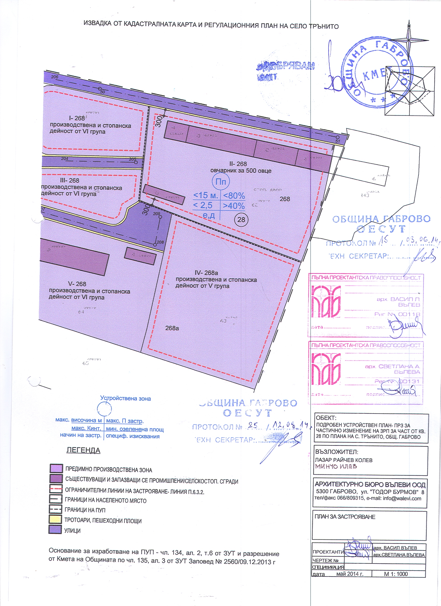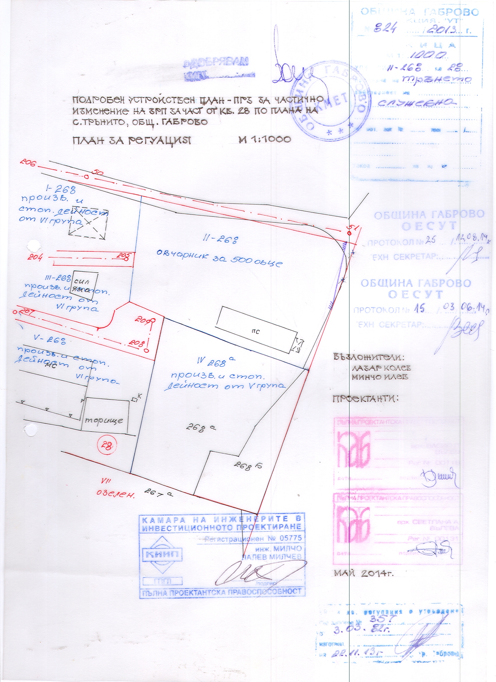 2 октомври 2014 ПУП на кв.Лисец 1 октомври 2014 Одобрен Подробен устройствен план – план за регулация и застрояване /ПУП – ПРЗ/ на част от кв. 17, нов УПИ ІІ-99, по плана на с. Армените, Община Габрово 3 октомври 2014
