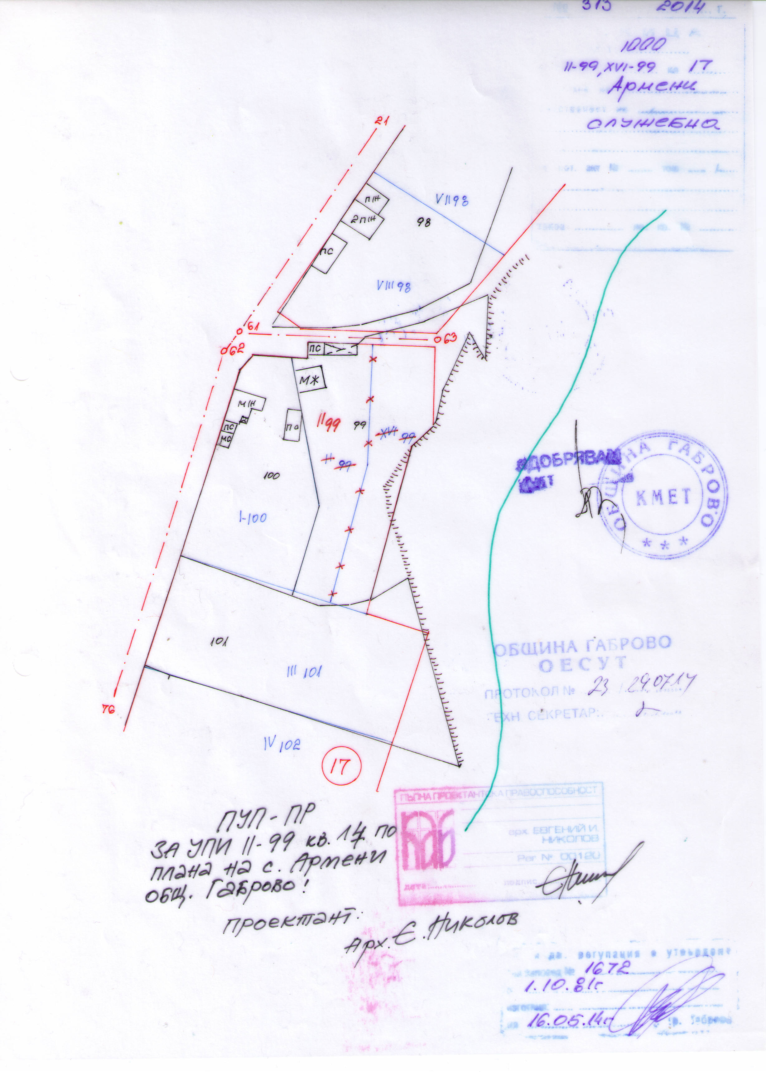 2 октомври 2014 Обявление №АУ-02-10-53#1/07.10.14 г. на Заповед №1971 от 07.10.14 г. на Кмета на Община Габрово, за одобрен ПУП-ПРЗ за частично изменение на ЗРП за част от кв. 17 по плана на с. Кметовци, Община Габрово.