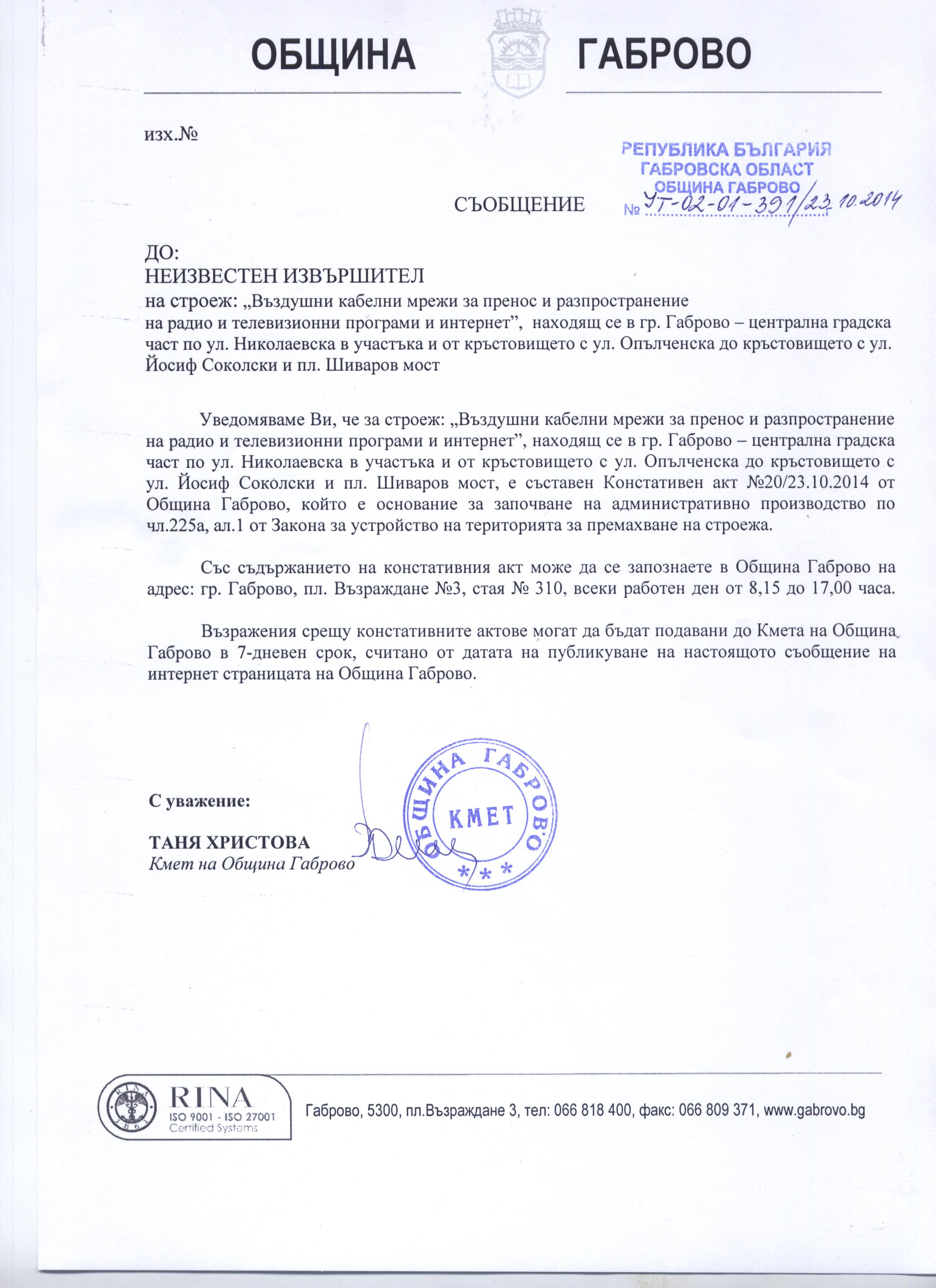 Уведомяваме Ви, че за строеж: „Въздушни кабелни мрежи за пренос и разпространение на радио и телевизионни програми и интернет”, находящ се в гр. Габрово – централна градска част по ул. Николаевска в участъка и от кръстовището с ул. Опълченска до кръстовището с ул. Йосиф Соколски и пл. Шиваров мост, е съставен Констативен акт №20/23.10.2014 от Община Габрово, който е основание за започване на административно производство по чл.225а, ал.1 от Закона за устройство на територията за премахване на строежа.