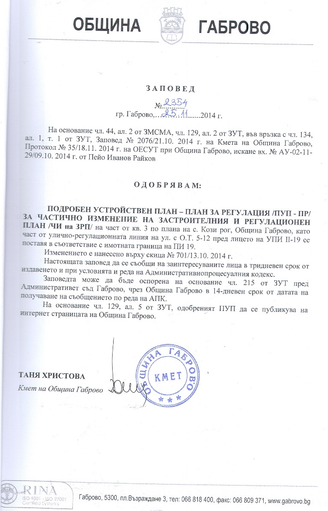 12 декември 2014 Съобщение за ПУП ПРЗ ЧИ на ЗРП 4 декември 2014 Съобщение за съставен констативен акт за незаконно строителство 16 декември 2014