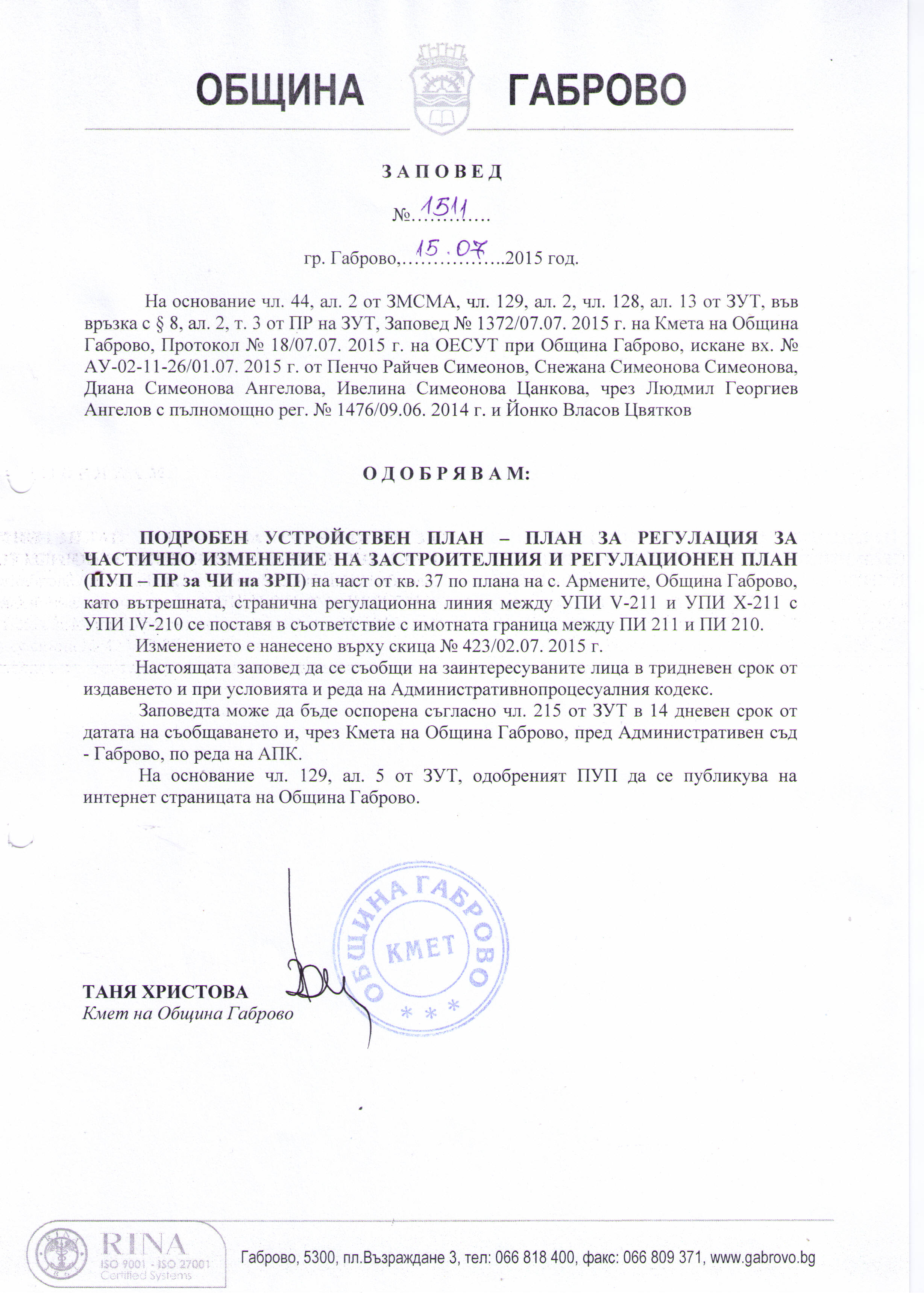 7 август 2015 Проект на ПУП - ПЗ на с.Донино 3 август 2015 С Ъ О Б Щ Е Н И Е Изх. № АУ-02-10-12#2/16.07.2015г. 12 август 2015